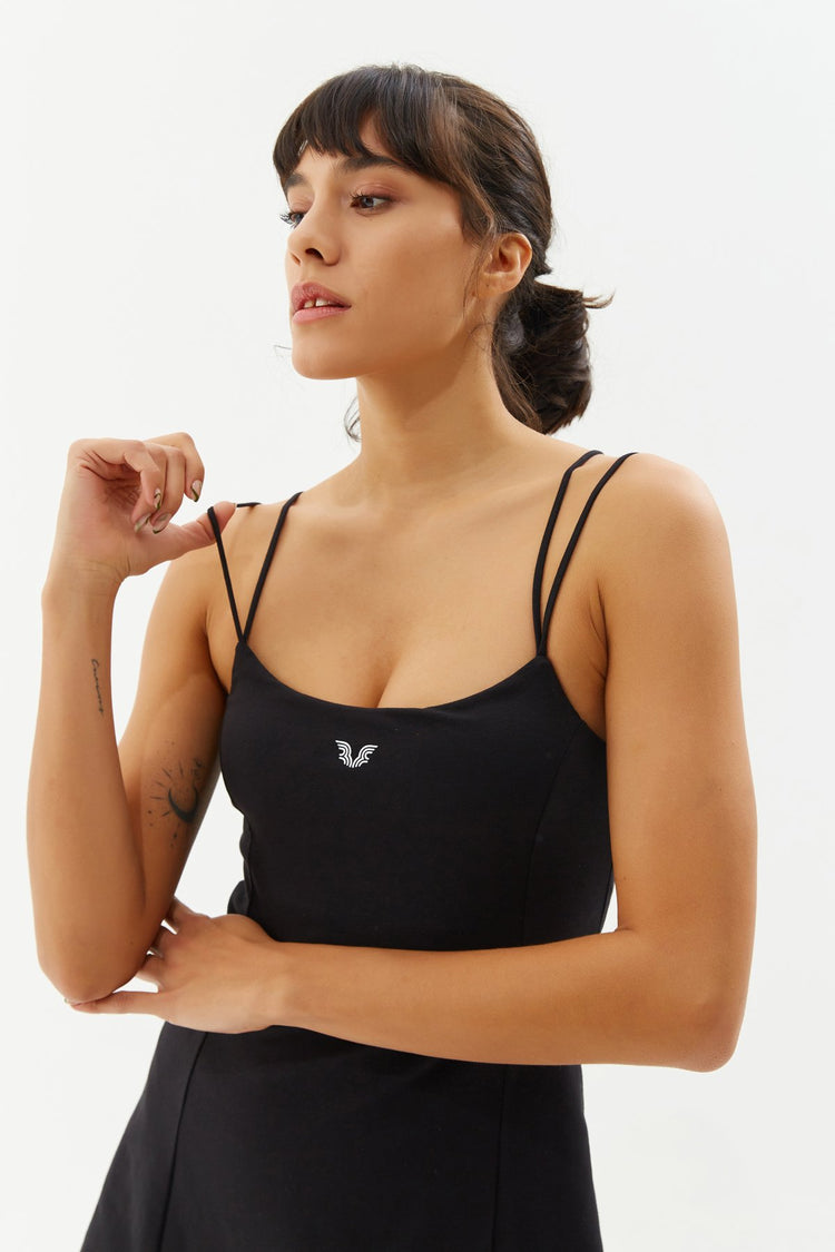 Abito con spalline sottili e sottoveste aderente che copre completamente il corpo e un enhancer per il seno. Con il suo tessuto in cotone e lycra che avvolge il corpo senza limitare i movimenti, impedisce al tessuto di stringere o causare disagio durante il movimento. Un capo utile che puoi indossare sia nella vita quotidiana che durante l'attività sportiva.